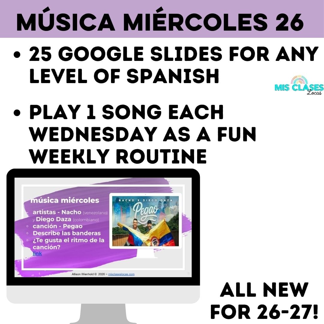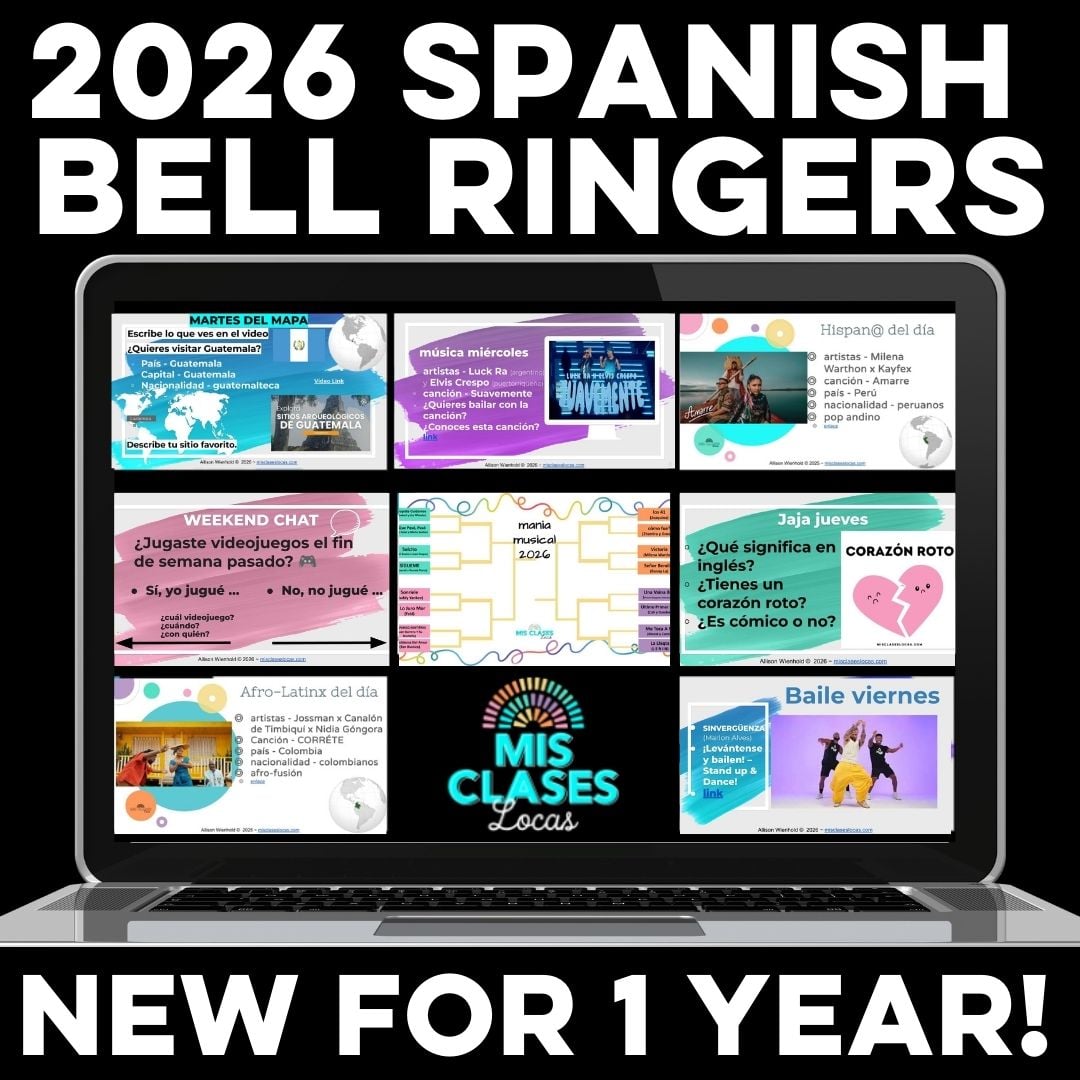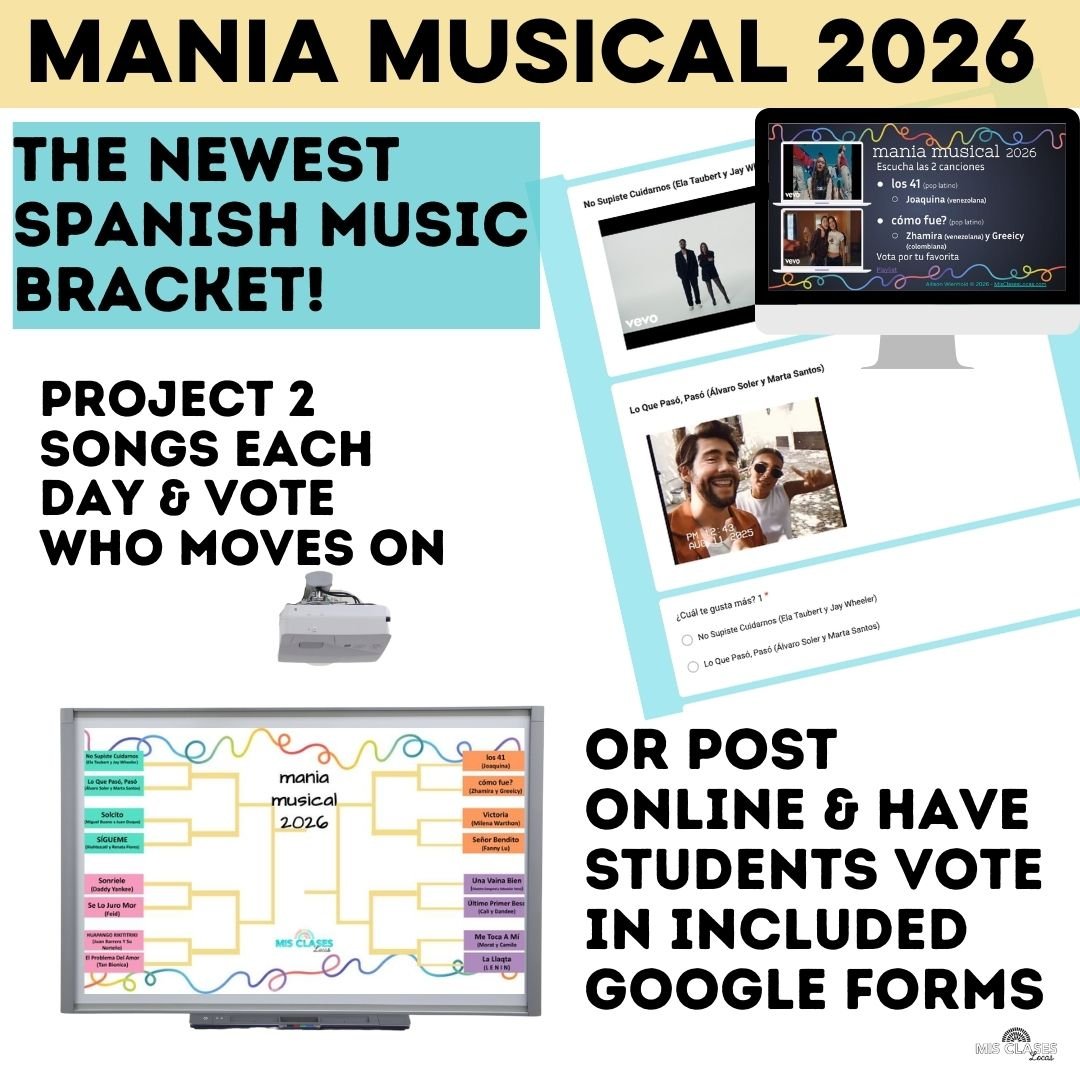 Ready to go, Editable Google Spanish class bell ringers, warm ups, or brain breaks for 1 year, every single day of Spanish class starters! This is the newest year of Para Empezar 26-27 resource, with current Spanish culture songs & authentic resources to use as a classroom management routine class starter, or brain break in Spanish class every day of the school year, including Hispanic Heritage Month and Mania Musical 2026 March Music Bracket for Spanish class.