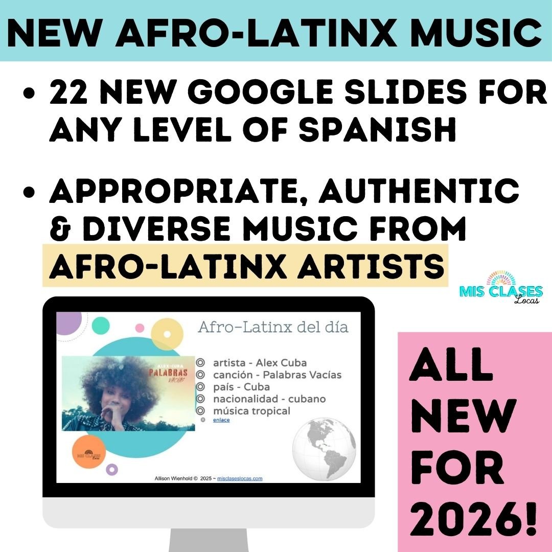 This Spanish Para Empezar 2026 bell ringer bundle has 8 separate editable Google slideshows. This was designed to fill a year if you pause to do the following included slides: Hispanic Heritage Month (Sep15-Oct15) (can do a bracket if you would like with one song from each country), Afro-Latinx music (Black History Month Feb) & Mania musical (March music bracket).