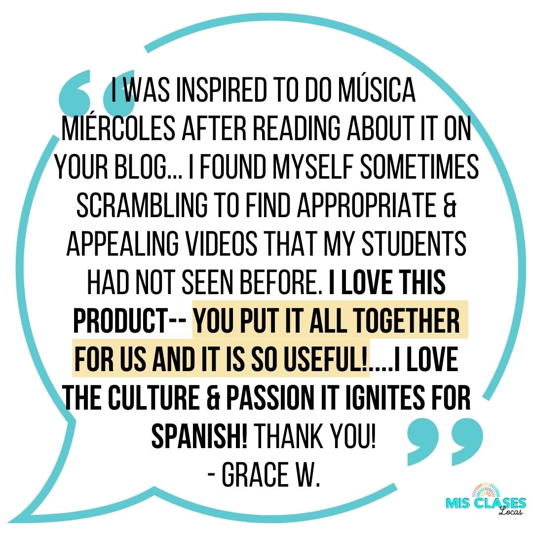 - ⭐⭐⭐⭐⭐ My students look forward to música miércoles every week. This has made it so much easier. I no longer down countless hours searching for appropriate music. – SueAnn – used in grades 7-11 Spanish