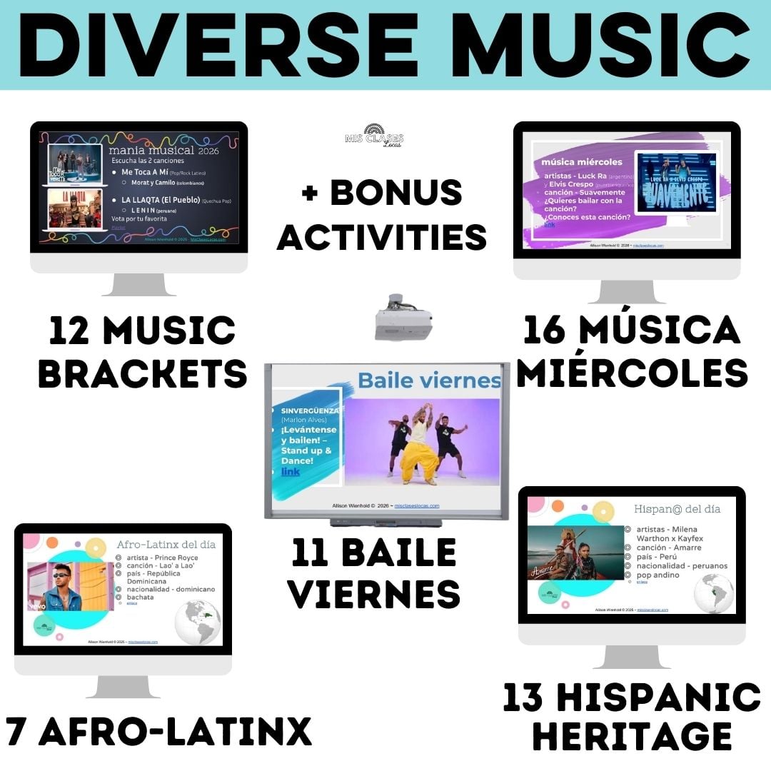 This Spanish class music bundle includes everything you would ever need for música miércoles, baile viernes, mania musical de marzo, Hispanic Heritage music madness, Afro-Latinx music, música indígena, and more with added current music every year.